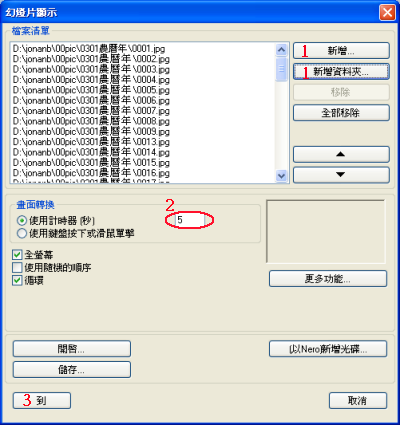1.工具 --> 幻燈片顯示 --> 用新增和新增資料夾將欲展示的圖片加進來。