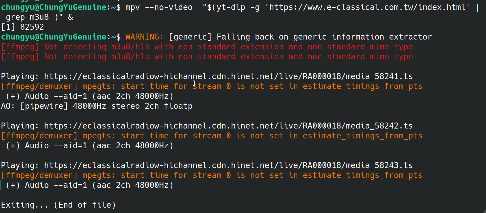 今天執行 mpv --no-video "$(yt-dlp -g 'https://www.e-classical.com.tw/index.html' | grep m3u8 )" & 時,會出現以下錯誤訊息,在播放了幾秒之後,便會停止播放音樂: