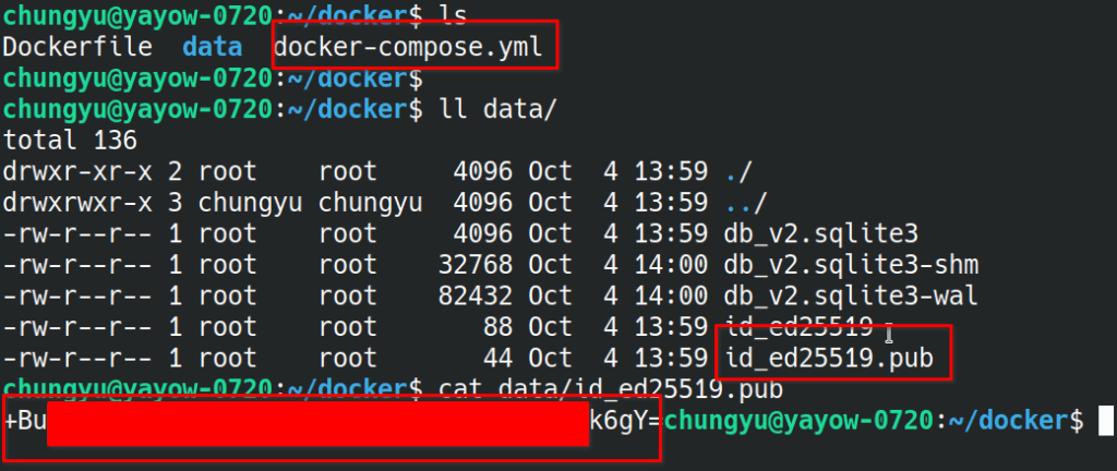 在上一個步驟,當我們執行「docker compose up -d 」時,在放「docker-compose.yml」檔案目錄中,會同時產生 data 這個目錄,在這目錄底下,「id_ed25519.pub」內容便是金鑰(key)了。