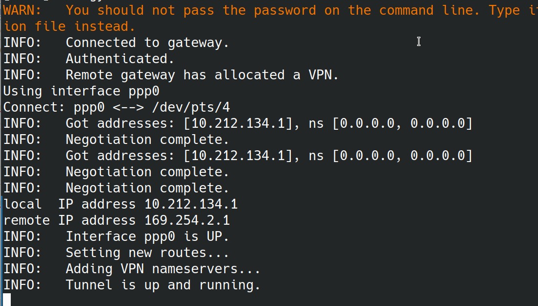 sudo openfortivpn 192.168.100.100:10001 --username=vpn_user01 --password=@@123456@@