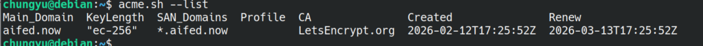 了解之後,決定使用 DNS-01 驗證方案,搭配使用「acme.sh」(簽證到期可自動續簽)工具。